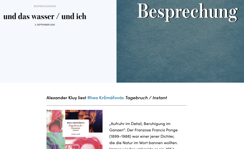 Für die österreichische Lyrikplattform Poesiegalerie rezensiert Rhea Krčmářová Erika Kronabitters Gedichtband Delfine vor Venedig (Bedingter Ausnahmezustzand in der Lagune) und den Foto/Gedichtband Ruster Ausbruch von Gerhard Altmann und Manfred Horwath (Von Derwischen am See und Störchen im Gegenlicht).